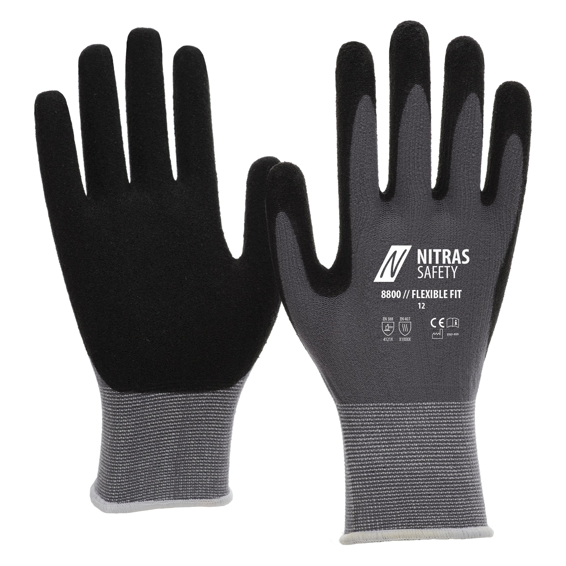 NITRAS FLEXIBLE FIT montagehandskerne er det perfekte valg for professionelle, der leder efter pålidelig beskyttelse og maksimal mobilitet. Disse grå handsker med sort nitrilbelægning (farvekode: 1210) er delvist belagt på håndfladen og fingerspidserne og tilbyder en strikket manchet for optimalt greb. De garanterer perfekt bærekomfort og fingerfærdighed, er velegnede til fødevarekontakt og tilbyder beskyttelse mod kontaktvarme op til 100°C i 15 sekunder. Handskerne er af førsteklasses kvalitet, opfylder OEKO-TEX STANDARD 100® og er særligt følsomme, ideelle til arbejde med små dele. De er kendetegnet ved deres skridsikkerhed, perfekte greb og høje slidstyrke (op til 20.000 slidcyklusser) og tilhører PPE risikokategori II.