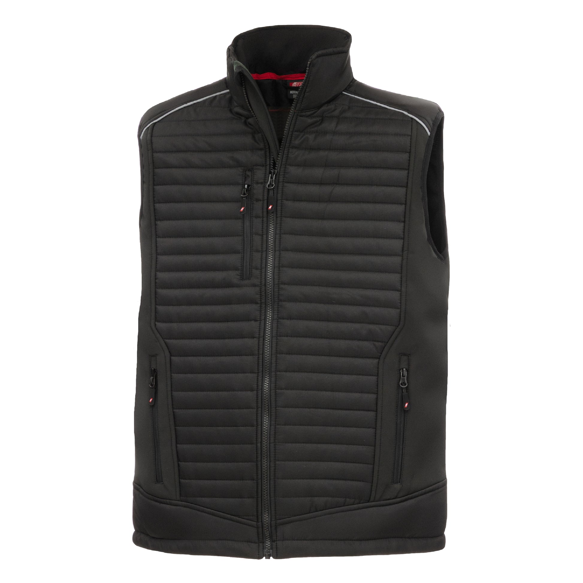 NITRAS MOTION TEX PLUS softshellvest i sort (farvekode: 1000) er behagelig at have på med en vægt på 340 g/m². Den forlængede ryg og snøre forneden sikrer optimal støtte og komfort. Vesten imponerer med sit sporty design og quiltningen foran og bagpå, som giver ekstra varme. Reflekterende elementer øger synligheden, mens den opretstående krave og YKK-lynlås i fuld længde med dobbelt-lags vindprop indvendig giver ekstra beskyttelse. Praktiske bryst- og sidelommer supplerer funktionaliteten. Produktet er OEKO-TEX STANDARD 100® certificeret og tilbyder en normal pasform.